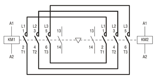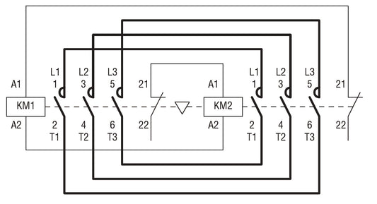 Reversing contactor assembly, AC coil, built-in interlock with power wiring only, 12A AC3 in AC, 5.7kW